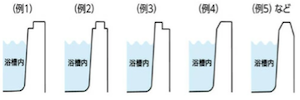 バスボードのストッパー高さは概ね6〜7cm程度です。浴槽の上縁の形状は下図の5例のよになっています。「例3」はほとんど問題ありませんが、その他の例の場合、上縁の細い先端ではなく、太くなった部分に押し当てて固定しますので注意が必要です。