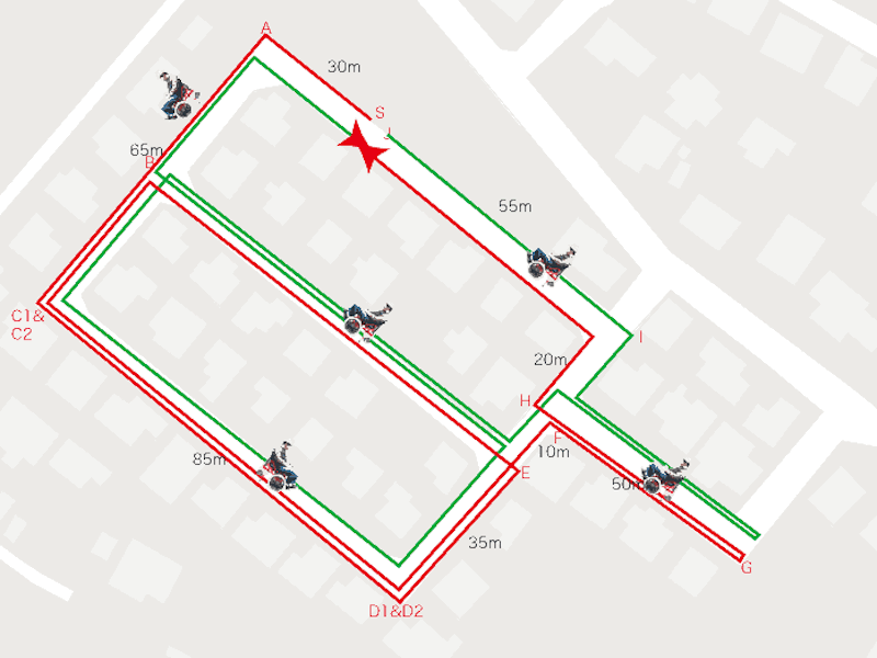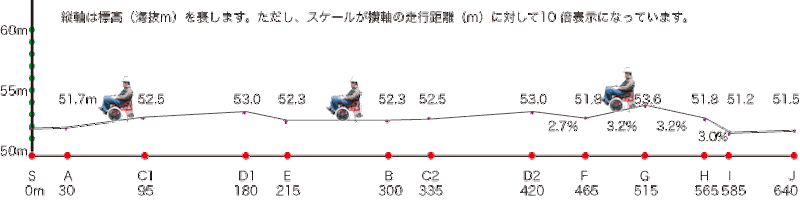 右図の赤いラインは前半で約640mあります。緑のラインは後半で前半の逆ルートを走行します。