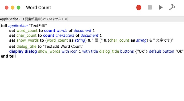 - 作ったスクリプトに「Word Count」と名前をつけ、先程作成した[TextEdit]フォルダに保存。
