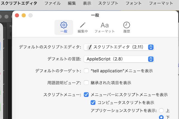 - [一般]画面で、「スクリプトメニュー」の「メニューバーにスクリプトメニューを表示」にチェックを入れ。左上の[×]で閉じる。