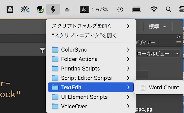 - メニューバーにスクリプトメニューアイコンが表示されるので、テキストエディットを開いて文字入力をしてから、スクリプトメニュー→[TextEdit]→[Word Count]をクリック。