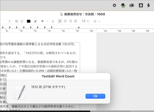 そこで、下書き用に使っているMacintoshの標準テキストエディタ「テキストエディット.app」を使っています。ここに、入力中に語数と文字数を表示できるようにしました。