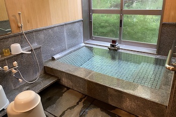 ○貸切風呂:長寿の湯は廊下から浴室まで段差がない。広めの縁に腰を降ろし、向きを変えて湯船に入れる。縁は低い。湯船は寝湯もできるような湯船。もうひとつの鶴の湯にも、手すりやシャワー椅子がある。