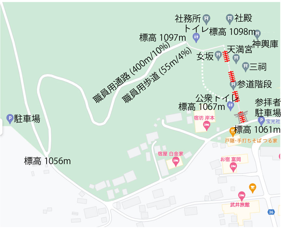 戸隠神社宝光社の主な標高は参道下が1061m、大鳥居を潜った手水舎エリアが1067m、社殿や社務所がある境内が1098mです。境内に行くルートは、大鳥居しかありません。長野市街地よりバードライン(県道36号線)を戸隠方面に進んでくると一番最初に見えてくるのが「宝光社」です(写真①)。写真①の右側にある駐車場に車を停めて歩いて来て、最初の階段を上がりきると大鳥居が見えてきます。石段は全部で260段あり、5つに区切られています。鳥居をくぐってからも3つあり、193段ある石段や杉の大木が見え、神秘的な雰囲気を感じることができます。