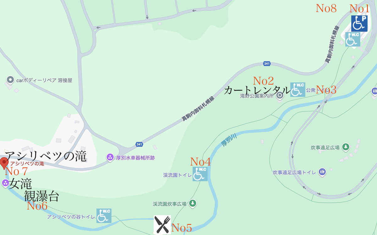 渓流口駐車場から遊歩道があり、アシリベツの滝(厚別の滝)まで広くゆったりした遊歩道(車椅子可)を約1.1km伸びています。平均勾配は3%未満ですが、焼肉ガーデン「あしりべつ」からアシリベの谷トイレまでの約200mは橋もあり9%の勾配です。ここの200mは老々カップルの車椅子使用者にはちょっときついかもしれませので、公園案内所で「電動カート」を借りて乗り換えましょう。観瀑台は滝から少し遠いですが、滝を真横から見ることができ十分楽しめます。