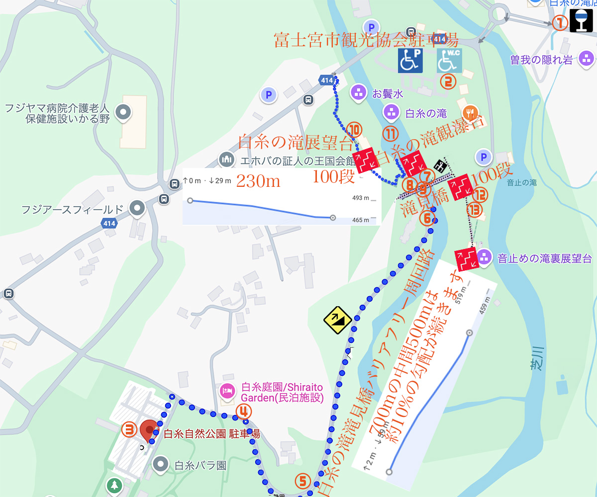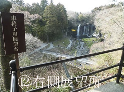 白糸の滝(静岡)には2つの展望所(対岸から遠くに見える、車椅子アクセス可能)と1つの滝下観瀑台(滝のほぼ下で見える、車椅子では約30m離れた滝見橋までしかアクセスできないが、2つの展望所より迫力がある)があります。