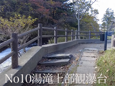 滝壺(滝下観瀑台)と幹線道路が海抜同レベルにあり、歩行距離もバス停「湯滝入口」から滝下観瀑台まで平坦な道を500m、一般駐車場から滝下観瀑台まで平坦な道を150mです。老々カップルの車椅子使用者でも、滝の飛沫や音を十分楽しめます。滝を上から見下ろせる上部観瀑台もありますが、ここにバス停は無く、約700m間の平均勾配5%もり、歩道が無く、道路の両端は車椅子が走行できる路面ではありません。