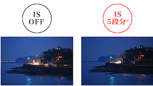 キャノンの説明によると、揺れ検出のアルゴリズムが一眼レフカメラのEOSから進化し、レンズのジャイロセンサーに加え、カメラのCMOSセンサーの画像情報からブレ量を検出。この2つの情報を比較解析することで、レンズ側で検出できなかった低周波の揺れも高精度に検知、補正することが可能です。レンズの光学ISと合わせて最大5段分を達成しました。