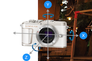5軸手ブレ補正は、前後左右の角度ブレに加え、水平方向の並進ブレ(水平シフト)と垂直方向の並進ブレ(垂直シフト)、さらに光軸回転ブレ(ローリング)を補正できます。特に光軸回転ブレへの対応はボディ内手ブレ補正ならではのもので、レンズ内手ブレ補正では実現が困難と言われています。ロールの補正はボディ内補正でなければできないが、最初に実現して5軸補正としたのが2012年のオリンパスOM-D E-M5である。