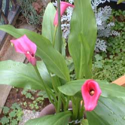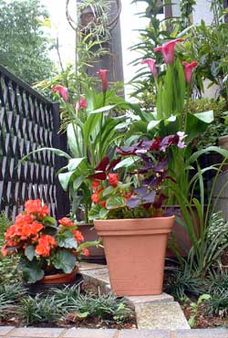 シンボルツリーは今まで植わっていたツツジを1本残しました。花は1年中咲いている状態を保つために、地植えをせずに鉢植えを4鉢置く設計にしました。今はクレマチス・シランは咲き終わり、インパチェンス・鉄砲百合に加え6月からはカラー・ベゴニア・オキザリスを置いています。