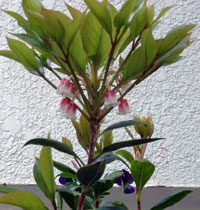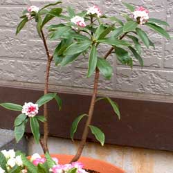 シンボルツリーは今まで植わっていたツツジを1本残しました。花は1年中咲いている状態を保つために、地植えをせずに鉢植えを4鉢置く設計にしました。今は沈丁花(じんちょうげ)・ジュリアン・パンジー・万両・ピンクシャンデリアを置いています。