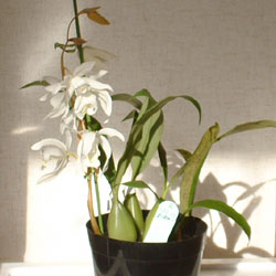 セロジネの冬場の最低温度は0~10℃です。霧吹きなどによって湿度を60%位に保ちます。10月~1月の昼間はレースのカーテンなどによる30%遮光は必要です。セロジネはある一定の低温(低温性の場合6-7℃)に当ててから暖かいところに移動させた方が花芽の伸びがよいと言われています。