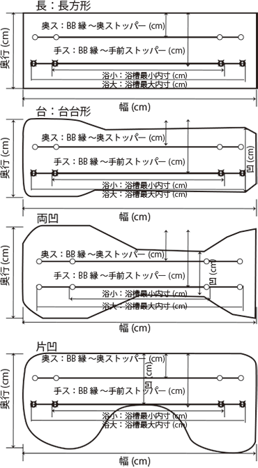 バスボードの形状は下図のような形状があります。圧倒的におおいのが長方形型です。しかし、奥行きが28〜40cmあり、跳ね上げるか取り外さないと浴槽の1/3ものスペースを占有してしまいます。台形型・両凹型・型凹型はその欠点を補うために「背ギリ」を設けたものですが、効果は限定的で無いよりもマシ程度でしょうか。この欠点を完全に補うものが安寿さんの「はねあげくん」です。しかし、スモールサイズのH-Sの幅が76cmですので、外径が74〜77.5cmの浴槽しか使えません。TOTO1220サイズの「ラウンド浴槽」には使えません。