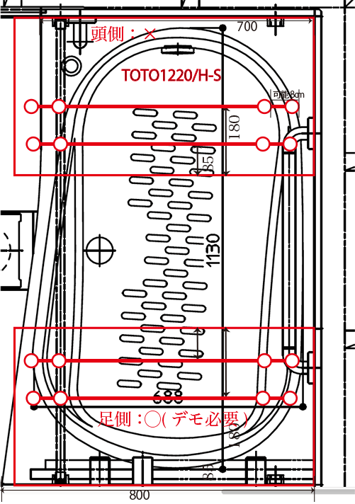 前記2項は目視で判断できますが、このことはそうはいきません。いくつか方法がありますが、管理人が第一に行っている方法は、浴槽図面の上に背景を透かしたバスボードを書いて、4つのストッパーが完全に浴槽の内壁に接触する否か、確認しています。管理人はこの作業を手書きでなく、デジタル化しています。