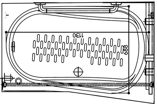 しかし、このラウンド浴槽を平面的に見ると外形や両側内壁形状に問題があります。まず外形を見ると、足側が800mm、頭側が700mmあり、足側から頭側に100mm湾曲しています。また、両方の短辺が半楕円型で中心に向かって大きく湾曲しています。これにより、奥側のストッパー列位置の浴槽内寸法が狭く、多くのバスボードは設置不可となります。