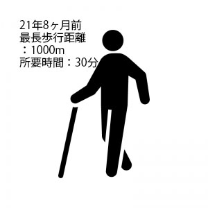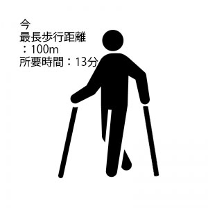 歩行補助具の視点からみると、21年8ヶ月前は杖1本でしたが、数年後には両手杖になりました。歩行能力の低下は確実に進み、手術後11年経った2009年9月には車いすを介護保険でレンタルするに至りました。しかし、全ての移動を車いすに乗ることはせずに、両手杖歩行を併用したパートタイム車いすユーザーとして頑張ってきました。しかしながら、最近の歩行能力は100mちょっとまで減少し、死ぬまでパートタイム車いすユーザーでいられるか否かです。危惧している根拠は、「21年8ヶ月間の1年当たりの歩行距離の衰退が約40m/年」であることです。つまり3年先には歩けなくなる可能性もある?