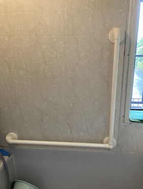 2.洗い場移動と浴槽の出入口「L型手すり」:滑りやすい浴室の中を安全に、安定した状態で移動するために横手すりが重要です。また、浴槽を「またぐ」という動作は、少しの時間ですが片足立ちとなり身体のバランスが崩れやすく、転倒や転落のリスクが最も高くなっております。管理人は縦手すりを使いますので、合わせて、L型手すりを使っています。