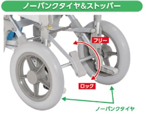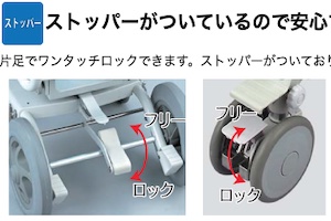 このページでは、前輪がキャスター・後輪がタイヤ式シャワーキャリーのほとんどに使われている、前輪はロックで後輪は踏み込んでブレーキをかけるタイプをご紹介しています。このタイプのブレーキ方式は約3割のシャワーキャリーに使われています。
