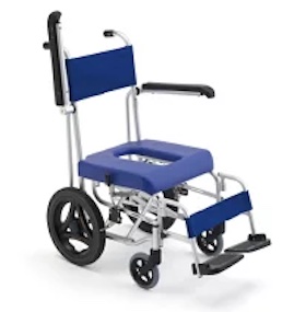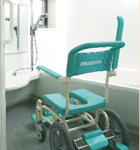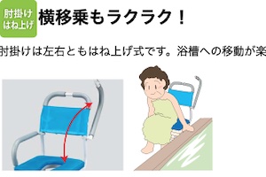 シャワーキャリーの跳ね上げ式肘掛けは自力で入浴できる使用者が、シャワーキャリーから浴槽に移乗したり、背中を洗うときなどに必要な機能です。