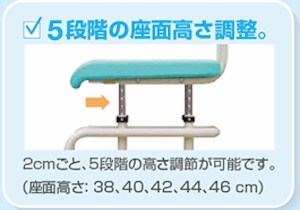 矢崎加工のシャワーキャリーの座面高さ調整は38〜46cm、5段階、2cm刻みの調整が可能です。