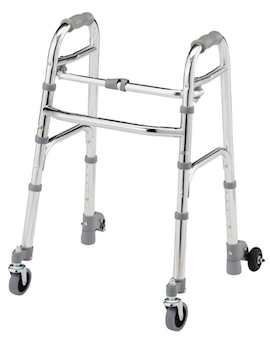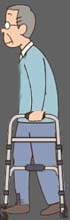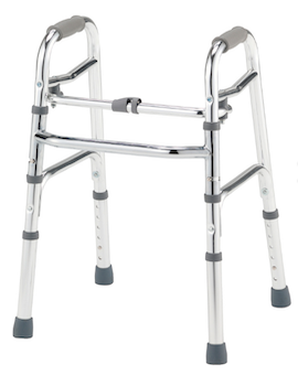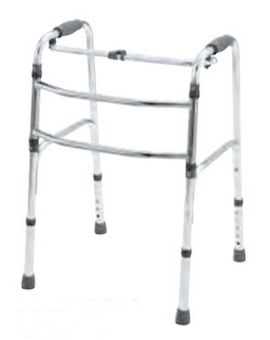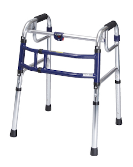 フレームが固定されている四脚歩行器で、SLIDEFIT/H-0188やアルコー10型Mのイメージ図を参照ください。歩行器を一歩前のほうへ持ち上げ、体を支えながら前進させます。主に室内での使用に向いており、立ち上がるときの手すりとしても活用できます。前進するには歩行器を持ち上げなければならないため、上半身の筋力がある程度ある人でなければ使用できません。下肢に筋力低下や痛みがあり、杖で歩行が不安定な人に適しています。