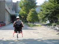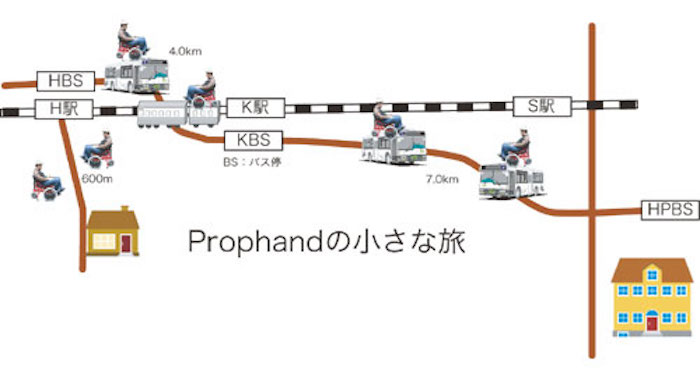 JRH駅に無事到着しましたが、降車のときに注意が必要です。一般の車いすの場合は、ティッピングレバーを使って、運転手さんが車いすを後ろ向きで車いす用渡り板に乗せてくれます。足漕ぎ車いすCOGYはステッピングバーがなく、3輪で車いすと体重を支えていますので、乗っている人がハンドルとブレーキを上手く操作して、バック走行と舵取りをする必要があります。それでもスムースに降車完了です。このとき、出っ張っているハンドルとブレーキレバーが整理券発行箱と当たりそうになるので注意が必要です。