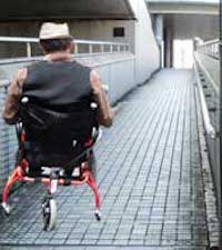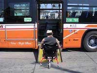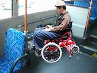 この路線にはノンステプバスとワンステップバスが走っています。運転手さんに『足漕ぎ車いす・COGY』でこのバスに乗りたい旨を告げると、早速車いす用渡り板(右の写真のイメージ)を出してくれました。足漕ぎ車いす・COGYは 車いす用渡り板の幅と勾配をクリア、運転手さんに押してもらいバスの中へ、乗車完了です。