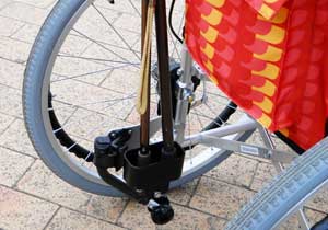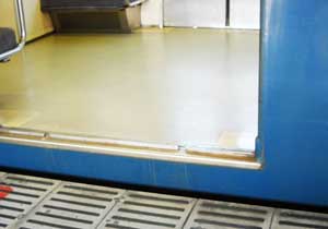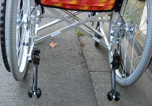 プラットフォームと電車の床の間には、隙間と段差がありますので、車いすを自走して乗り込むことはできません。一人車いすで行くために改札口で駅員さんに乗車介助をお願いしておきますと、電車が到着する少し前に、駅員さんが折りたたみ式のスロープ『デクパック』を抱えて来てくれました。さつそく、プラットフォームと電車の床の間に折りたたみ式のスロープ『デクパック』を設置していただき、無事乗車できました。私鉄の電車には、手すりがある車いすスペースがあり安心して一人車いすで行くことができました。