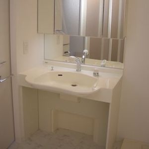 洗面台の高さ:車いすに座ったままで洗顔するためには、洗面台の下に空間があり、車いすがその空間に入れる必要があります。