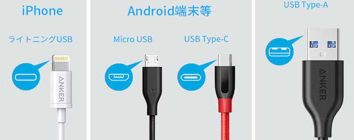 micro-USB、USB-TypeC、Lightningのコネクタや変換がついており、様々なデバイスに対応しているモバイルバッテリーもあります。