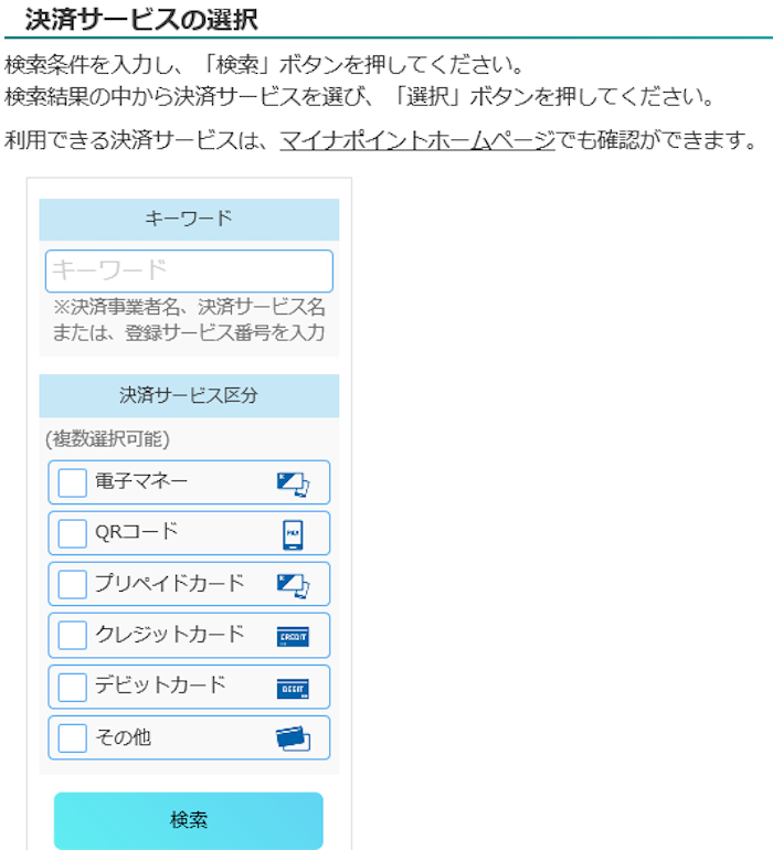 サービス名がわかっていれば「キーワード」欄に入力します。または、下のチェックボックスから選択します。そして、「検索」ボタンを押します。正確なサービス名がわかっていなければ、「利用できる決済サービス」のページを開き、コピー&ペーストすれば確実です。管理人は、「○○ CARD」と入力すると、検索エラーになりました。「利用できる決済サービス」で正式名称を見ると、「○○ カード」でした。