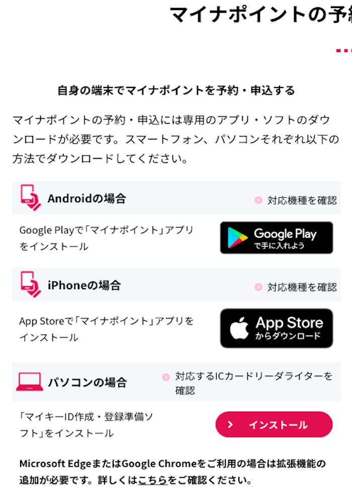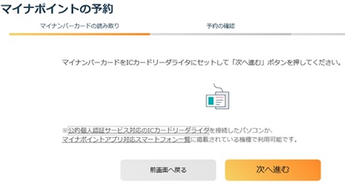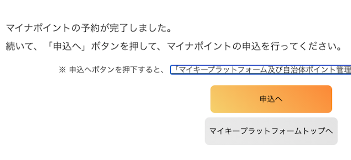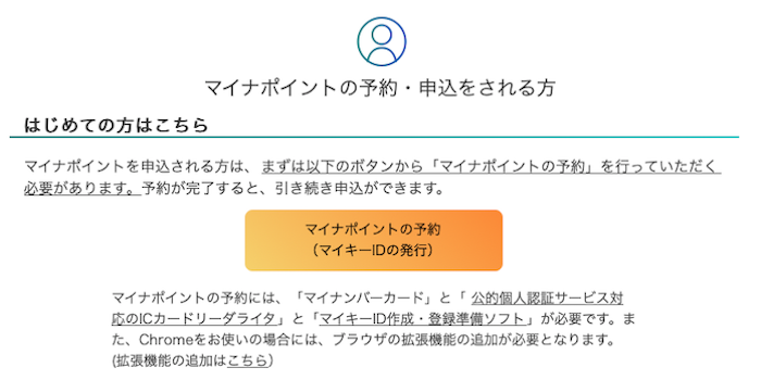 「マイキーID作成・登録準備ソフト」のインストール完了後、ソフトを起動するのではなく、先ほど、ブラウザで閲覧していた「マイナポイント」ページに戻り、「マイナポイントの予約(マイキーIDの発行)」ボタンをクリックします。