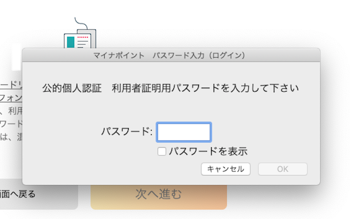 「次に進む」をクリックでき、パスワード入力画面が表示されますので、パスワードを入力します。このパスワードは、マイナンバーカード受領時に入力した、「利用者証明用電子証明書」(半角数字4桁)です。署名用電子証明書(英数字6文字以上16文字以下)ではありません。