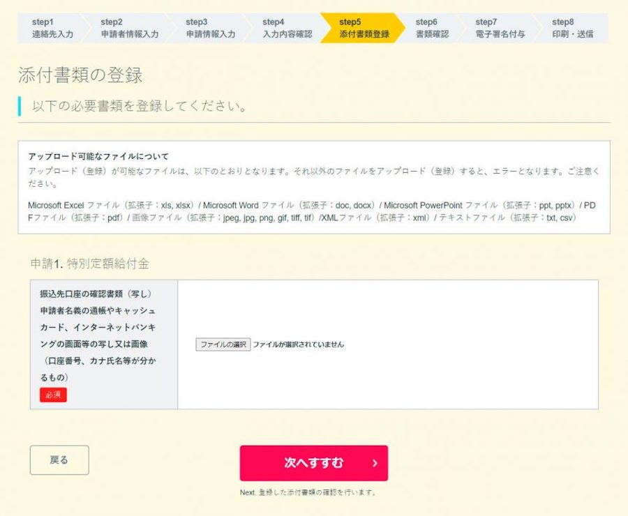 申請者(世帯主)名義の通帳やキャッシュカード、インターネットバンキングの画面等の画像ファイル(拡張子:jpeg,jpg,png,gif,tiff,tif)/PDFファイル(拡張子:pdf)/テキストファイル(拡張子:txt, csv) 等アップロード(登録)可能なファイルを準備しておく必要があります。ファイルの内容は金融機関名、口座番号、口座名義人等がはっきり分かるようなものが必要です。
