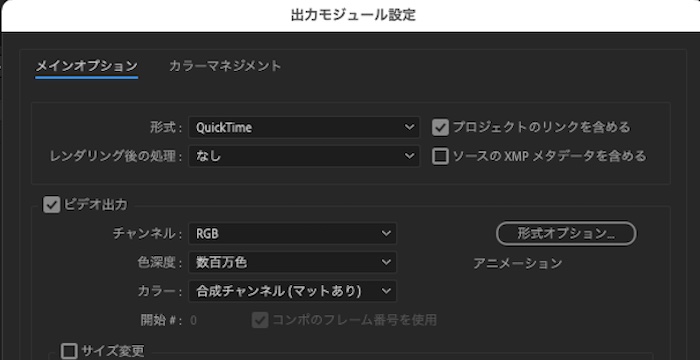 管理人は使用状況から判断して、After Effects上で作業する場合はアニメーション形式を使用し、書き出し時に「ProRes」に変換して出力することにしました。そこでその方法を記述します。