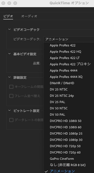 ビデオ出力の形式オプションが「アニメーション」になっています。これを「ProRes4444」に変更します。