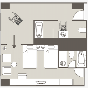 ○障害者対応客室:29.7㎡ツイン1室、定員:2名、広々とした専用のバス&トイレ(引き戸&手摺)、手摺付き洗面台、コネクティングドアあり、ベッドサイズ/台数:W121×L196cm/2台、バスルームにはシャワーキャリー・バスボードがあり。