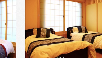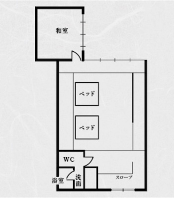 ○障害者対応客室:本館・十楽棟。バリアフリー対応の和洋室のお部屋(定員:5〜6名)。3世代ご家族そろって思い出つくり。入口にはスロープを設け、床は全面フラットに仕上げました。お部屋は2床のベッドがある洋室と、和室の2間続きです。車いすのままで使用することができます。トイレは車いすのままで使用することができます。浴室は洗い場にはシャワーチェアーを全室設置しており、湯船にも入りやすくなっています。洗面所は低く設置し、洗面台の下はオープンなので車いすのまま使用いただけます。