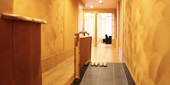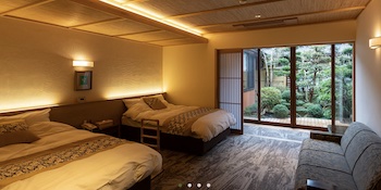 ○障害者対応客室:庭園付き離れ松風庵:岩清水は車椅子の方も部屋の中でくつろげるバリアフリーの部屋です。本間にはダブルサイズのベッドが2つ。ベッドルームからは、窓いっぱいに広がる手入れの行き届いたお庭が見られます。奥には琉球畳を備えた和室も用意しました。
