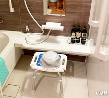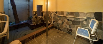 ○貸切風呂:先着予約制。洗い場まで車椅子のまま移動できるように段差をなくしました。また、手すりを各所に取り付け、トイレ・洗面所も広いスペースを確保するなど、身体の不自由な方にも安心していただけるようにバリアフリーの充実を心がけました。洗い場には背もたれ付きシャワーチェアがあり。