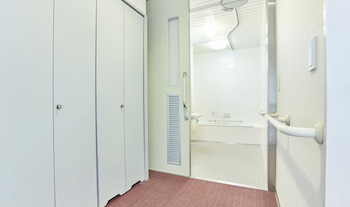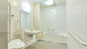 ○障害者対応客室:73㎡バリアフリー対応客室(バス付き)で利用人数5名です。安心して過ごせるバリアフリーのお部屋。すべてのお客様に快適にお過ごしいただけます。電動リクライニングベッド1台とシングルベッド2台に、小上がり付きの客室です。小上がりは畳6畳になっており、お布団を3枚まで敷くことができます。「介護施設みたい」と言う口コミもあり、個人のお好みによりますが非日常を味わえない感もあります。