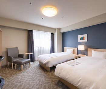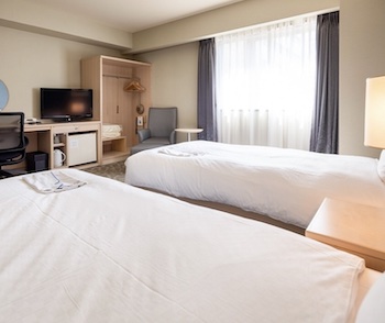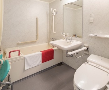 ○障害者対応客室:29㎡ユニバーサルツインルームあり、定員:2人、ベッドサイズ(W×H):110㎝×200㎝×2台、車椅子でのご利用も可能なバスルームやトイレを完備。お部屋も広めの作りとなっております。ツインルーム入口ドア:引き戸。3点ユニットバスには滑り止めマット、入浴介助椅子、バスボード設置