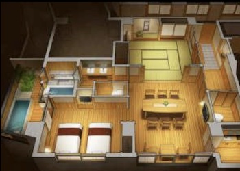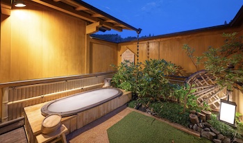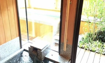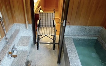 ○障害者対応客室:本館全面バリアフリー露天風呂付きスイートルーム[胡蝶蘭の間]。和室10畳+ダイニングルーム+ベッドルーム+露天風呂、ツインベッドルーム、定員2〜6名。全面バリアフリー客室となっており、玄関からスロープで段差無く入ることが出来ます。お手洗いは手摺があり、車椅子のままお入りいただくことができます。車椅子のまま、洗面台の前につけることができます。車椅子のまま、内湯の出入り口につけることができます。内湯の横の柱に手摺・腰掛けスペースがついております。洗い場と内湯浴槽間は1m未満。内湯を出て左の柱に手摺がついており、露天風呂に入る部分にも銀色の手摺がついており、その間の距離は2m未満。露天風呂の手前に踏み台があり、踏み台に手摺・腰掛けスペースがついております