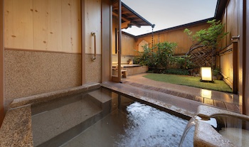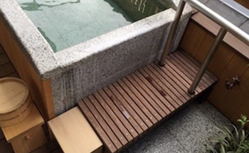 ○内湯付きの貸切露天風呂:浴槽は腰掛けスペースと手摺を設置。浴槽脇まで車椅子の移動可能