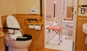 大浴場「手長足長の湯」は入口にスロープを設置し車椅子入浴システムあり。バリアフリールーム内浴室にはバスボード・シャワーチェア・浴槽台あり