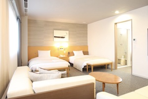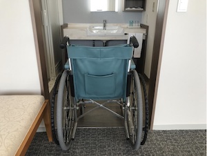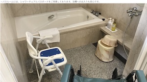 ○障害者対応客室:車椅子を利用の方や、お身体の不自由な方にも安心して利用いただけるバリアフリー対応のお部屋(47.7㎡、定員4名)。室内は段差も無く、ドア幅や通路スペースも広めで車椅子利用の方にも安全・快適にお過ごしいただけます。緊急時、フロントへ繋がるお知らせボタンも設置しています。壁側のベットには電動ベッド(①背上げ②膝上げ③昇降機能の3モーター)が1台、レース・カーテンの開閉は電動式となります。バスルームとお手洗いは別々となります。バスルームには、シャワーチェアとバスボードをご用意しております。浴槽への出入りも安心です。