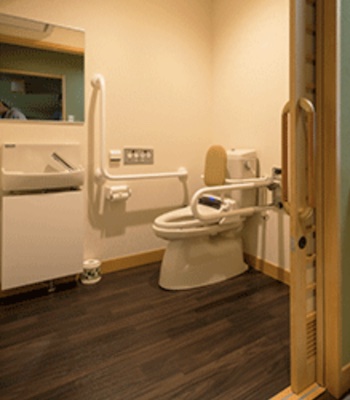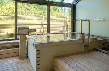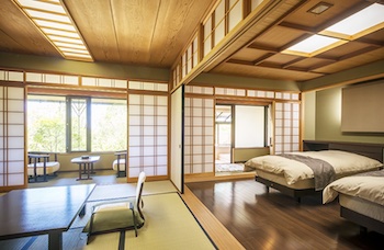 ○障害者対応客室:星見露天風呂付客室(ユニバーサルスタイル) 琴柱草。車椅子の方も使いやすいユニバーサルデザインの部屋。ツインベッドルーム+10畳和室の二間続き。ベッドルームから和室への上り框は8.5㎝。和室側にもユニットバスがあり、分割して使うことも可能。天井と一側面がガラスの専用露天風呂は洗い場まで総檜造りで、バスルームとお手洗いは別々となります。バリアフリートイレの入口は引き戸、便座回りには手すりを完備。浴室用シャワーチェアはなし。浴槽への出入りも安心です。浴槽脇に手摺と踏み台があり、これらと介助があれば、湯船に入れる方もいると考えて、掲載しています。