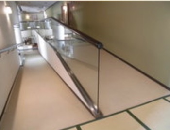 ○障害者対応エレベーター:なし、2階建てで2Fの客室からメインロビーにつながるスロープです。幅118cm、長さが11m、傾度が8度です。