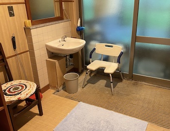 ○貸切風呂:長寿の湯は廊下から浴室まで段差がない。広めの縁に腰を降ろし、向きを変えて湯船に入れる。縁は低い。湯船は寝湯もできるような湯船。もうひとつの鶴の湯にも、手すりやシャワー椅子がある。