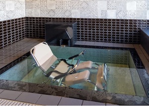 ○車椅子のまま入れる「昇降式貸切温泉」:湯船の床が昇降式となっており、専用の車椅子を利用することで、車椅子のまま入浴が可能。専用の車椅子をフラットになった湯船の床まで移動し、レバーを引くと床が下降し入浴できる仕組み。車椅子を利用の方でも温泉のご入浴を愉しめます。肩まで浸かることはできません。